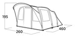 - Family tunnel tent with a spacious living area and a rain-protected front entrance