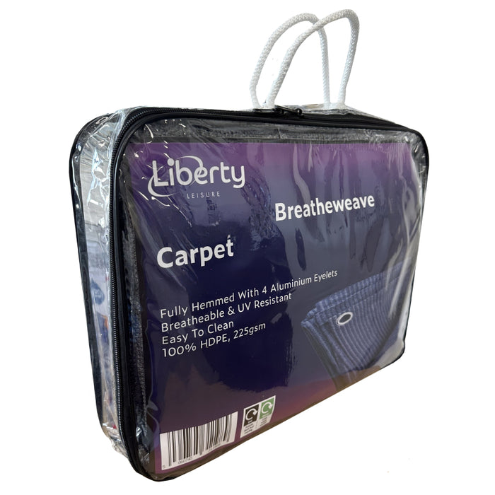 Introducing the Liberty Leisure Outdoors Breatheweave awning carpet, designed for versatility and durability. This carpet is perfect for use in caravans, motorhomes, and tents. Made from 100% High-Density Polyethylene (HDPE), it is both breathable and washable, keeping out bugs and dirt while allowing grass to breathe. With a weight of 225 grams per square metre, it is fully hemmed and eyeletted for easy installation and comes with a convenient zipped carry bag.